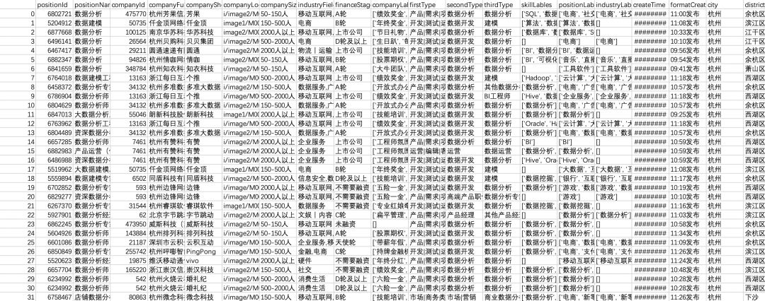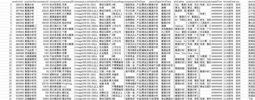 本文在拉勾网招聘信息中选择北京、上海、广州、深圳、杭州这五个城市下分别以数据分析师、算法工程师为筛选条件来采集样本,采集到的原始数据如下: