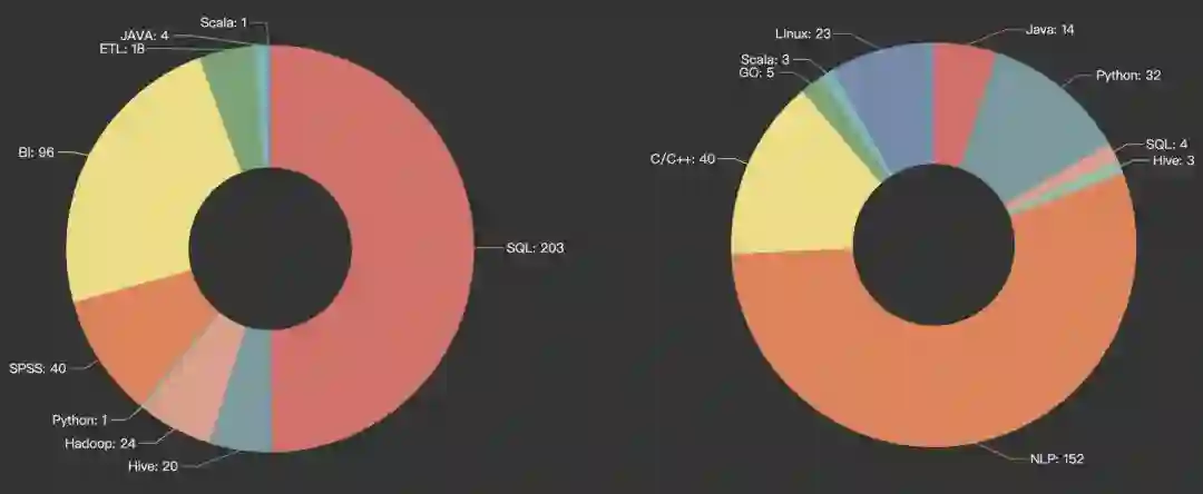 可以看到对于数据分析师来说,需求最高的是SQL,其次是BI软件与SPSS以及Hive和Hadoop等大数据相关,虽然也有Java等,但是总体对于编程语言需求不高,值得注意的是只有一家公司需要应聘者会使用python(用女朋友担保真的只有一家需求中含有Python)。再看右边的算法工程师,对于NLP的需求最高,其次C/C++、Python、JAVA、GO等各种编程语言都有,值得注意的是有些企业还需要求职者懂一些Linux运维相关的知识。