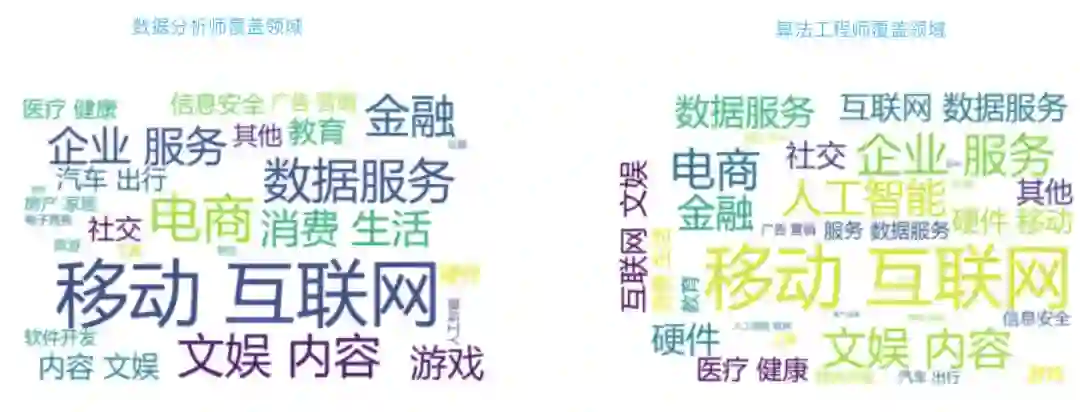 上图为我们根据发布招聘信息的企业所属领域/行业的文本信息绘制的词云图,从图中可以看出数据分析师与算法工程师的行业有较大的交叉,主要都属于移动互联网、金融相关企业,但数据分析师的数据服务、电商、消费生活企业更多,而算法工程师的人工智能相关企业占比较高,所以想从事人工智能相关岗位的同学就往算法方向准备吧。