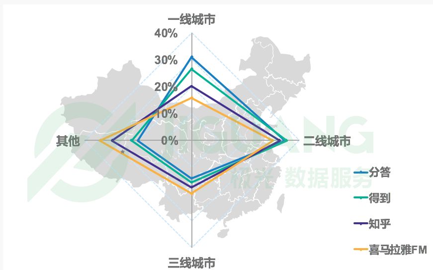 在年龄分布上,知识付费 app 用户年龄以20~24岁为主。得到 app 的用户中20~24岁占比为47.6%,知乎为53.1%,20~24岁用户占比在分答上则为50.2%,喜马拉雅FM人群分布较均衡。