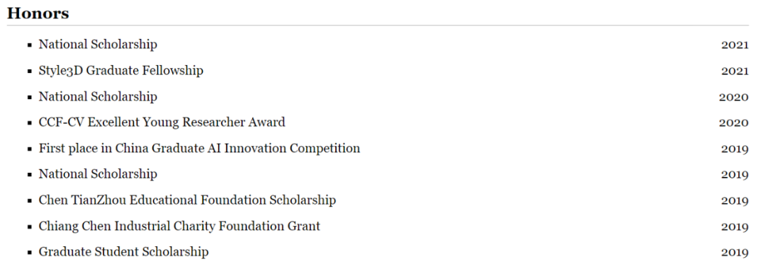 彭思达还获得过国家奖学金、Style3D 研究生奖学金等多项荣誉:
