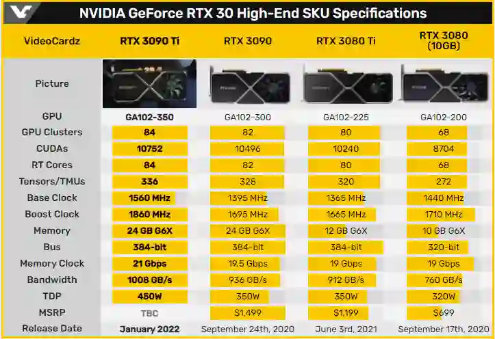 据了解,RTX 3090 Ti 将是第一个使用满血版 GA102 核心的游戏卡,开启全部10752个流处理器、84 个光追单元、336个张量单元、336个纹理单元,核心频率提高到 1560-1860MHz。同时,GDDR6X 显存在维持 24GB 容量的同时,频率提高到史无前例的 21GHz,要知道即便 RTX 3090 也只有 19.5GHz。可能也正是频率设定过高,才出了问题。