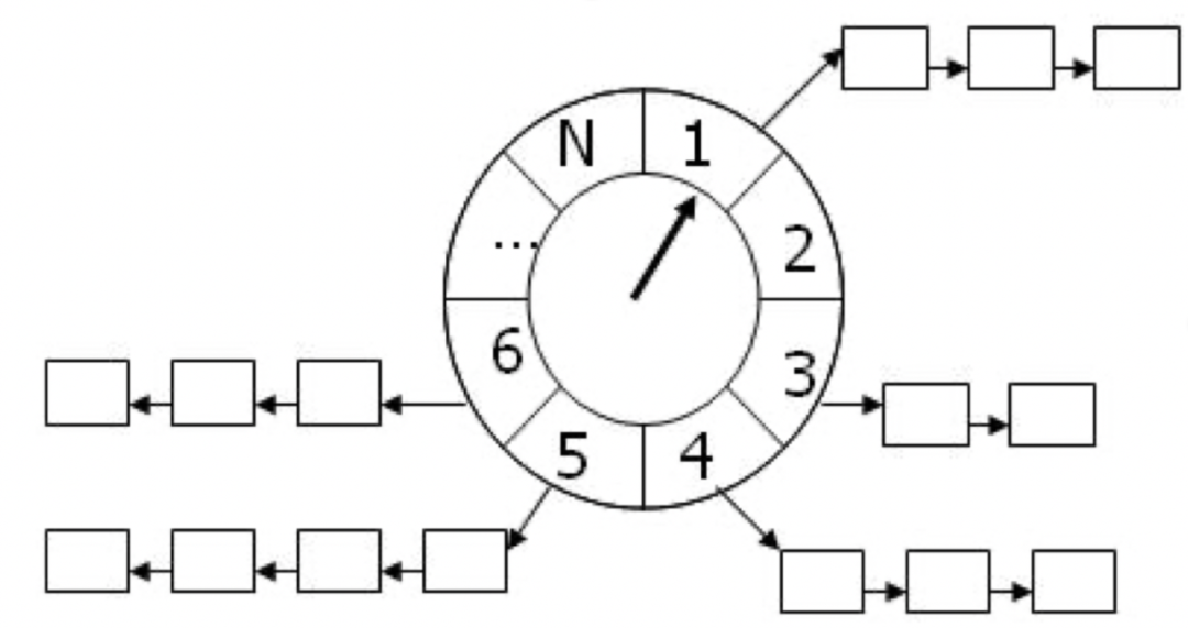 时间轮的算法模型如上图所示,每个时间轮存在着 N 个槽,两个槽之间的间隔时间固定。每走一个时间间隔,指针就向前推进一格,然后开始处理当前槽内的所有任务。指针不断循环推进,直到时间轮中不存在任何任务。