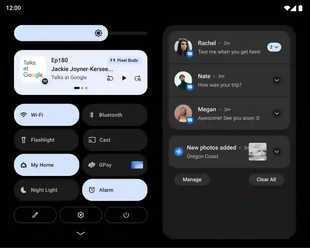 Android 12L 在 Android 12 的基础上,优化了通知、快捷设置、锁屏、概览、主屏幕等元素的显示,让它们在大屏设备上更美观易用。