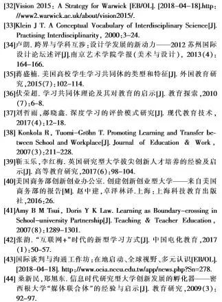 跨学科创新也是高校跨界创新的主要形式之一。实施跨学科领域获取跨界知识,变革高校创新教育的国际范例主要有:1965年创立的英国华威大学,它是世界著名的研究型大学之一,素以交叉学科研究为特色,以跨学科授课模式为传统,弱化学院之间分割现象,打破专业课程独立设置局面。例如,该校开设的跨学科课程《生物工艺和商业管理》,旨在培养兼具生物专业技术与管理能力的创新人才。《2015年远景规划:华威大学的战略规划》(Vision 2015:A Strategy for Warwick)则明确指出,华威战略要集中于跨学科的挑战[32]。跨学科理念赋予华威大学强大的创新力,更使其稳居世界百强。
