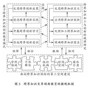 如前所述,跨界知识变革创新教育的三个抓手迫切需要落实,具体内容为:构建基于跨界知识的创新教育模式、开展跨界知识加工与创新的规律研究"进行面向跨界知识供给的第三空间建设。这三个方面的内部机理及其相互作用,共同构成了跨界知识驱动创新教育的微观机制(见图3)。