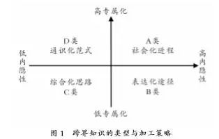 探究创新过程中跨界知识的类型,以及不同类型跨界知识的加工策略,是目前高校创新教育研究中不可回避的重要内容。为此,我们根据跨界知识的内隐性和专属化的程度不同,把跨界知识分为四种类型(见图1):高内隐性高专属化(A类)知识、高内隐性低专属化(B类)知识、低内隐性低专属化(C类)知识和低内隐性高专属化(D类)知识,每种类型的跨界知识都有其特有的加工策略。