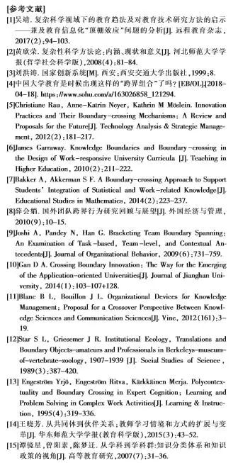 当前,“跨界”可谓是一个热词,在诸多学科、领域被频繁提及。跨界中的“界”,即“边界”,如:从生物工艺专业到商业管理专业的跨学科边界,从个体到共同体的跨群体边界,从高校到企业的跨组织边界,从学科课堂到共创空间的跨空间边界。这些跨越各种场域边界的现象,统称为跨界。跨界的发生源于看似无关的两个(或多个)学科领域或系统组织的事物,在共同的主题下、在边界位置上,在复杂需求中,产生了交叉融合。跨界的英文表述多样,其中使用频率较高的是Boundaiy-crossing[5-7],它强调人类行为对场域边界的挑战;也有部分学者表述为Transboundary,Boundary-spanning[8-9],Crossing Boundaries或Crossing Boundary[10];另外,Crossover也符合“跨界”的原始追求和意愿,表示交叉与融合[11]。