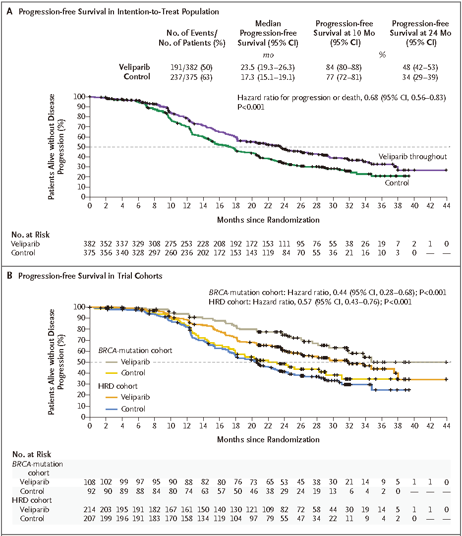 通过对比分析,研究发现在携带BRCA突变的患者中,接受Veliparib联合化疗作为维持治疗的患者的无进展生存期(PFS)中值是34.7个月,而对照组中接受化疗加安慰剂维持治疗的PFS中值为22个月。同样的,对于任何肿瘤同源重组(HR)缺陷的患者,联合治疗的PFS为31.9个月,而对照治疗仅为20.5个月。