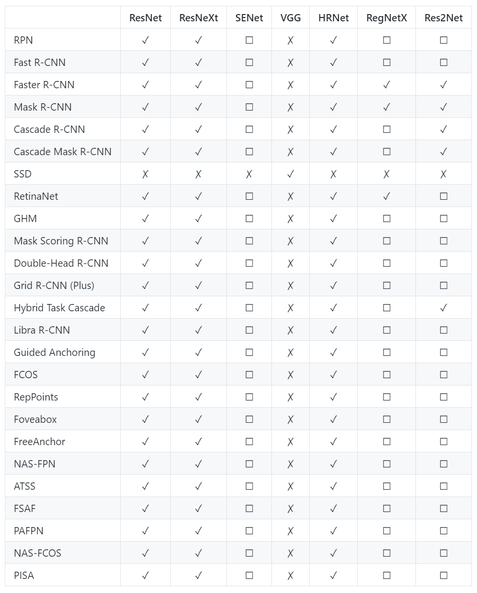 截至 2020 年 5 月底,MMDetection 官方模型库已经支持了35篇论文中的算法,提供了超过 250 个预训练模型,是目标检测领域最大规模的模型库。除此之外,还有 16 篇论文在 Github 上开源了基于 MMDetection 的代码。目前官方支持的方法如图所示: