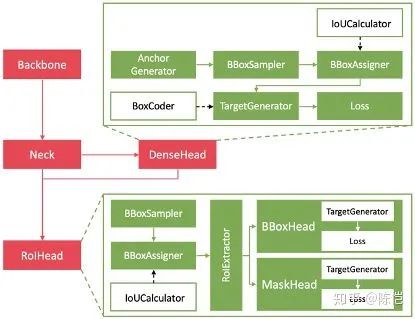 从设计上看,MMDetection V2.0 的模块化设计比之前的版本更加细粒度,使得更多的模块可以被更灵活地替换或调整,让 MMDetection 从单纯的目标检测框架向检测类任务的框架平台转变。新的模块设计如下图所示。
