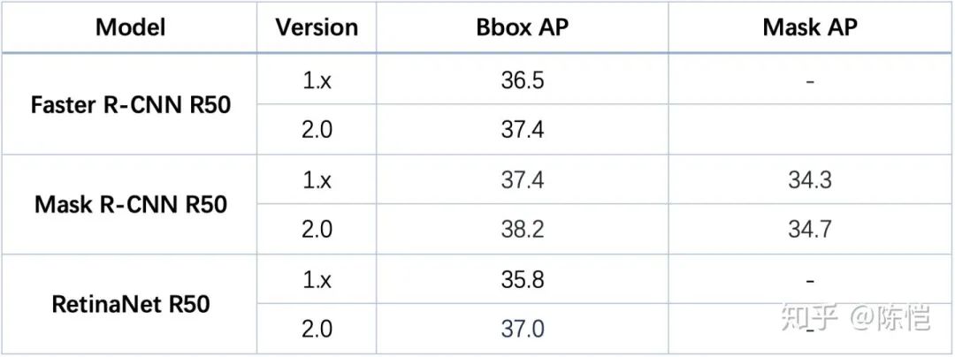 MMDetection V2.0 的基准模型精度相比于 V1.x 有了显著的提升。我们虽然在 V1.0 的技术报告中对各种参数做了 ablation study,但是代码库中的默认配置选用了最朴实无华的版本。在 V2.0 中,在不增加训练和测试代价的前提下,通过对默认超参的调节和实现的优化,例如使用 L1 Loss 而非 SmoothL1 Loss 等,获得了不小的精度提升。Detectron2 在这方面也有不少可圈可点的地方,和 MMDetection V2.0 的主要区别在于默认采用了 multi-scale 训练,而我们仍然选择以 single-scale 作为默认配置。不过在采用相同参数的情况下,精度几乎一致。