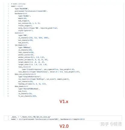 V2.0改进:我们设计了新的 config 系统,支持了多重继承机制。将常用的数据集配置、基础模型以及训练策略放到了 _base_ 文件夹中,每个新的 config 只需要继承一个或者多个已有的 config,然后对其中需要修改的字段进行重载即可。下图是 Mask R-CNN R-101 的配置文件在 1.0 和 2.0 版本的对比。V2.0 版本 只需要 2 行,而且所有的改动一目了然,如下图所示。