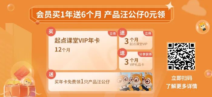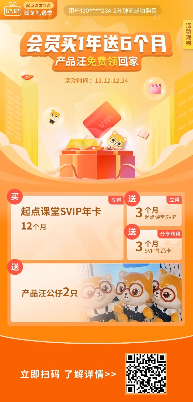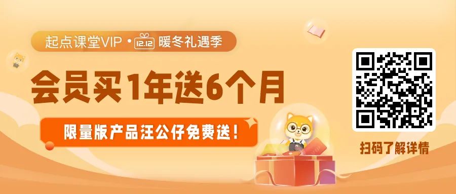本汪总结下,就是在双12活动期间购买起点课堂会员,即可买1年学18个月+免费领产品汪公仔(我我我)回家
