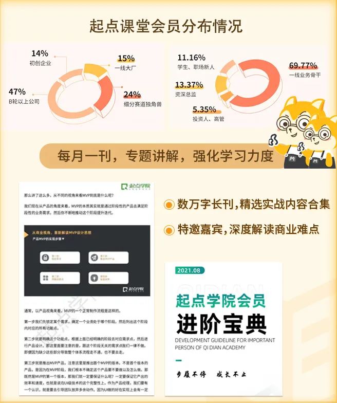 加入起点学院的会员后,会有专门的VIP会员专属社群,成员都是来自各大赛道头部企业。经调查有47%的同学在B轮以上的公司工作,24%的同学在细分赛道的独角兽公司,还有15%的同学来自BAT、TMD这些互联网大厂。
