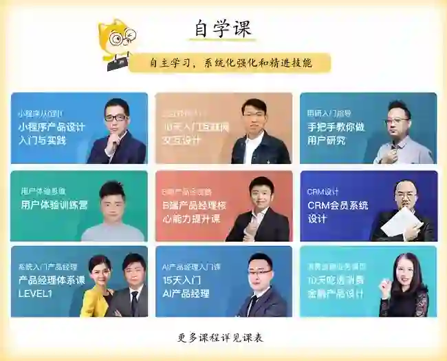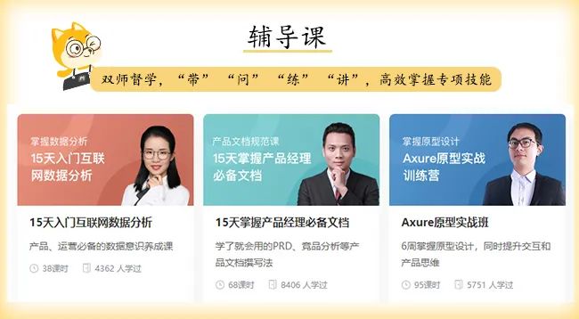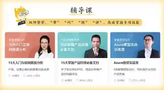讲师背景:精心筛选的700多位来自阿里、腾讯等顶级大厂的实战派导师,平均拥有10+年的一线实战经验,从他们身上,你将学到来自一线大厂已被验证的产品、运营专业方法论。