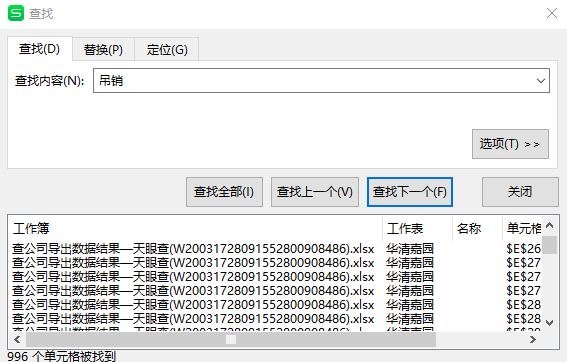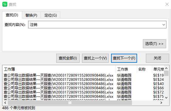 吊销、注销,就可以粗浅地理解为一家公司的失败和死亡,Excel检索显示,华清嘉园公司里,吊销公司数量为996家,注销公司数量为486家,合计1482家。也就是说,死亡的公司达到1482家。