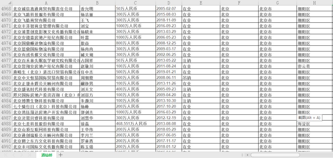 我们来分析酒仙桥。在酒仙桥周边的公司一共有4991家。吊销公司数量505家,注销公司数量493家,死亡总数量为998家。我们算一下酒仙桥公司的死亡率。
