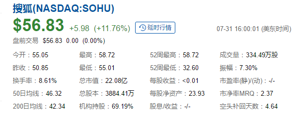 受业绩表现超出预期以及搜狗计划在美秘密IPO等刺激,7月31日当天,搜狐盘前大涨22%,全天涨幅超过11.76%,创下近4年来最大涨幅。