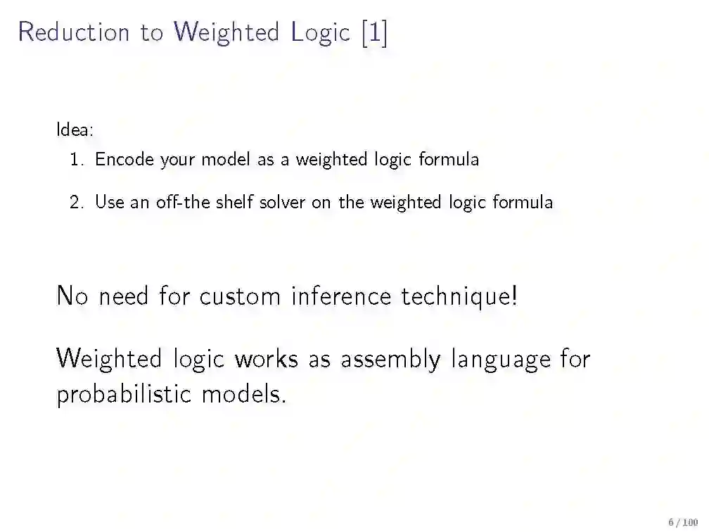 随着人工智能和机器学习在我们日常生活中的日益普及,迫切需要不仅智能而且安全、公平和可验证的系统。在现实世界中部署这样的系统通常等同于在表现出连续(定量)和离散(定性或逻辑)特征的领域中执行概率推理。这样的域通常被称为混合域。然后通过代数约束或逻辑约束对混合域进行约束,实现安全性和公平性。这进一步复杂化了执行概率推断的问题。此外,许多逻辑和代数约束可以来自环境本身,例如物理定律,或有助于描述系统的“正确”行为,例如必须满足的安全特性。在本教程中,我们介绍了加权模型集成(WMI),这是一个减少混合域概率推理的框架,以计算离散-连续逻辑公式的权重。因此,它是对已经广泛应用的加权模型计数(WMC)框架的一种推广。在教程的第一部分,我们逐步建立WMI的理论背景-一个旅程,我们开始从纯逻辑推理一路到混合领域的概率推理,同时提供涉及的挑战和连接到WMC的指针。其次,我们通过讨论WMI的应用,以及描述最具前景的开放工具和方法,提供了一个关于混合域概率推理问题的实用视角。