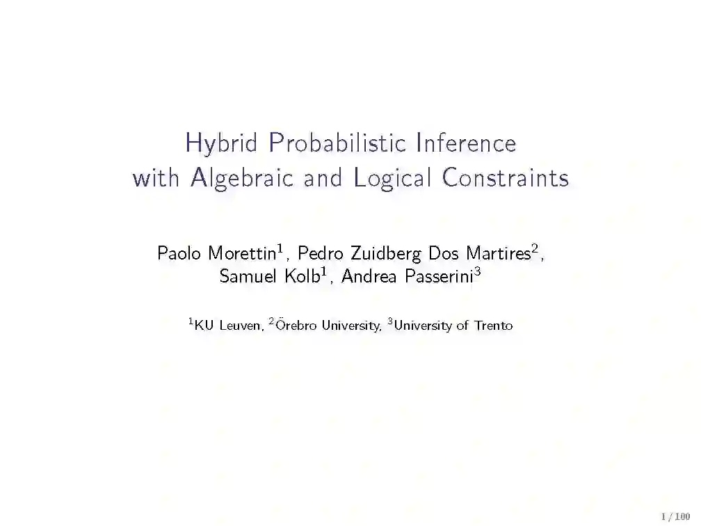 在本教程中,我们将学习代数和逻辑约束下的概率推理。我们将涵盖与受限环境下的概率推理相关的理论基础和计算挑战,同时探索高度相关的应用,如混合系统的概率形式验证和通过构造满足约束的学习模型。