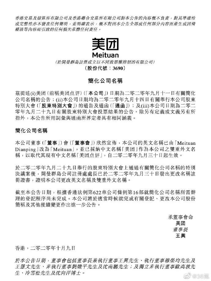 36氪获悉,10月9日消息,美团点评公告,公司的英文名称已由“Meituan Dianping”改为“Meituan”,并已采纳中文名称“美团”作为公司双重外文名称,以取代其现有中文名称“美团点评”,自2020年9月30日起生效。