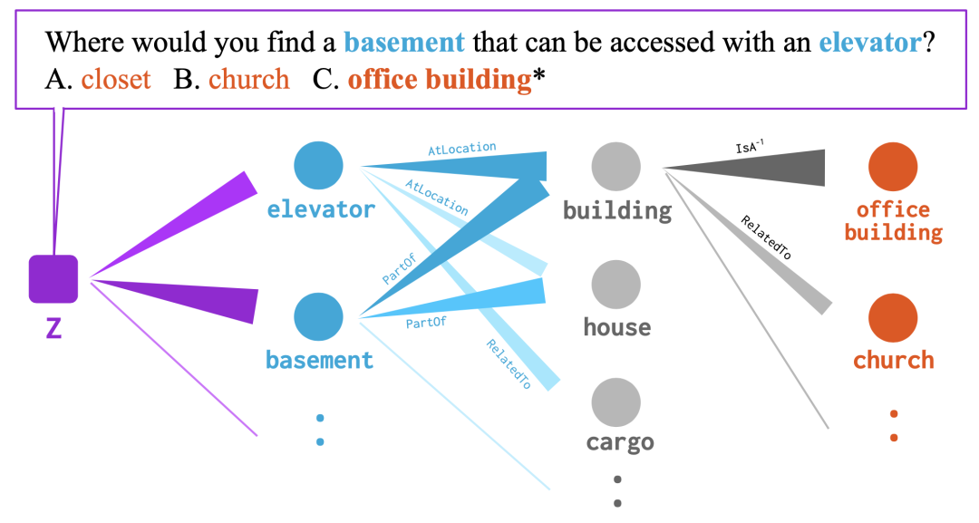 这里提问:哪里能找到有电梯的地下室呢?衣柜、教堂、办公楼,三选一,答案显然是办公楼。在这个 case 里,模型预测出了 elevator → building → office building 和 basement → building → office building 两条路径,这看起来都能解释答案的选择逻辑。