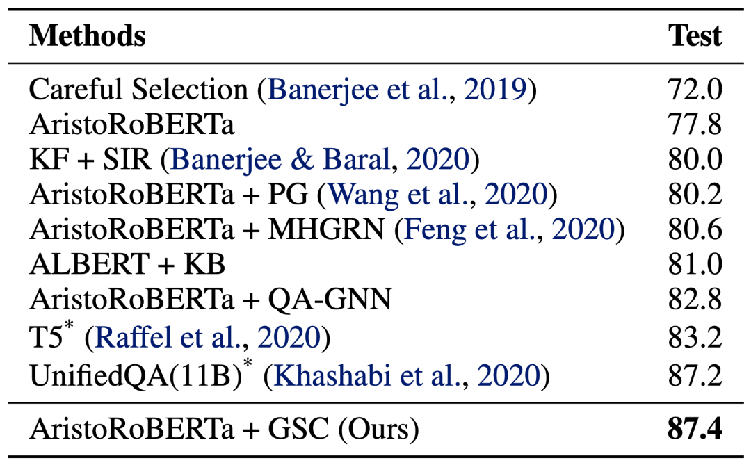 在 OpenBookQA 上,GSC 也有相似的惊人效果,甚至在 leaderboard 上超过了 30 倍参数的 UnifiedQA!