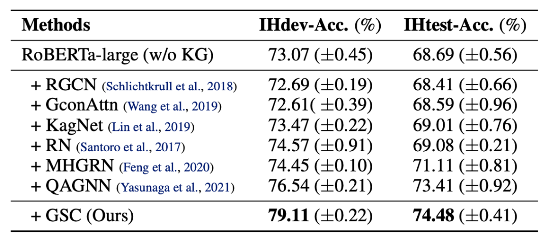 在 CommonsenseQA 上,GSC(本方法)超过了所有基于 GNN 的方法,在 dev 和 test 上分别由 2.57% 和 1.07% 的提升。