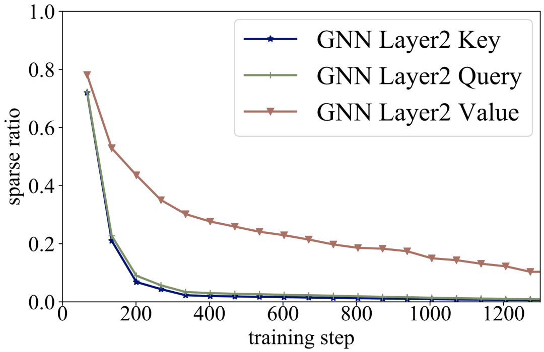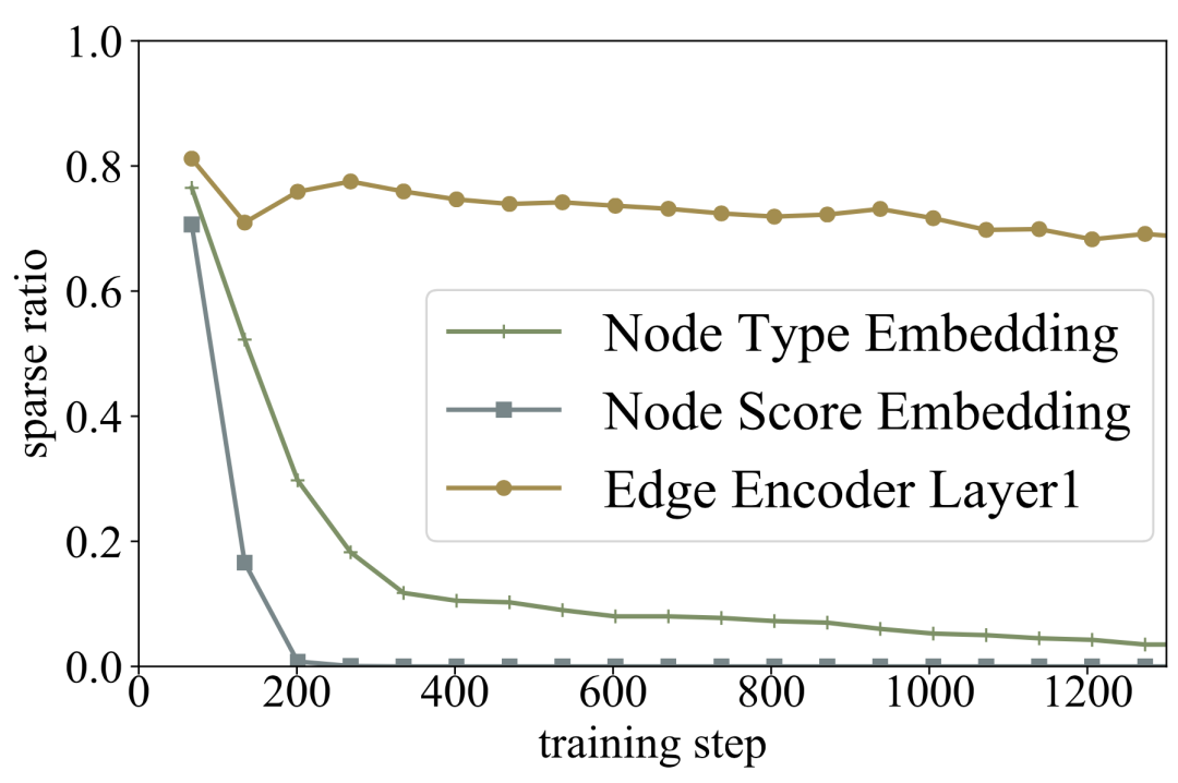 随着训练的推进,GNN 前面节点的 embedding 层越来越没用,但边的表示一直对最后的预测准确率有很大影响。