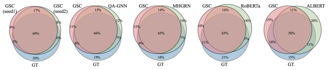 怎么才能证明 GSC 也有推理的能力呢?作者们采用了这样的一个假设:如果 GSC 的预测结果和基于 GNN 推理的模型预测结果比较一致,那么就说明 GSC 也有与 GNN 差不多的推理能力。实验发现,两次 GSC 的结果与 ground truth 的交集有 69% 的重合率(下图第一个),而 GSC 与前面不同 baseline 和 ground truth 也有 60% 左右的重合率,且与基于 GNN 推理的模型重合率更大。这表明 GSC 与 GNN 有差不多的推理能力。