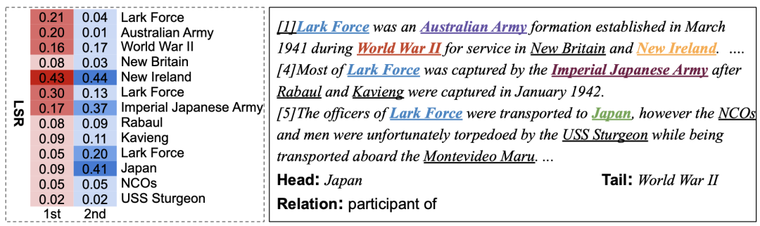 图中右边是文本,大概讲的是二战中几个国家军队的故事,下划线的是实体;左边是 World War II 这个实体,在两层 GNN 中,分别对所有实体的注意力权重。这样我们也能得到与前一个例子相似的一些推理路径:World War II → New Ireland → Japan 和 World War II → New Ireland → Imperial Japanesae Army。这也解释了为什么 Japan 与 World War II 是“参与者”的关系。