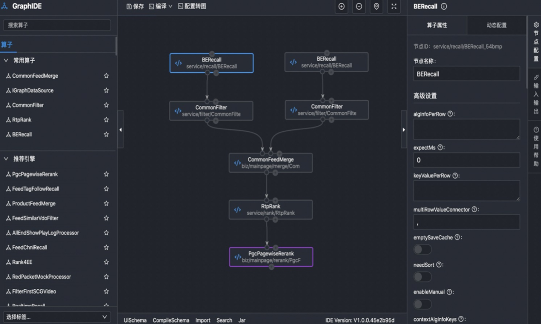 召回、预估、合并、打散、过滤等业务操作封装为业务算子,在业务算子中可以查询数据源,返回数据集后通过基础算子计算得到结果。最终业务图中执行单元为业务算子和数据源,业务图中通过对数据源和业务算子的依赖关系进行配置,表达业务逻辑。