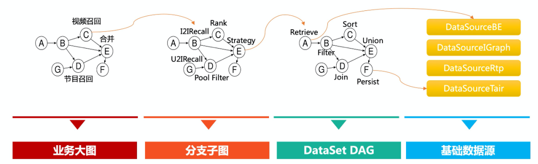 通过业务子图、基础数据集、基础数据源等层面的将业务进行分解,基础数据集API和通用数据源算子和业务无关,业务层通过使用基础API进行业务算子实现和依赖组成最后业务逻辑图。最终达到业务层、基础层的复用。