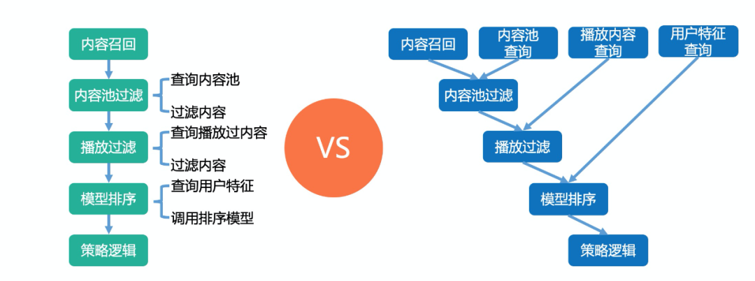 在图架构之前,模块的封装都以串行逻辑运行,其中会存在一些可并行优化的处理逻辑。比如在播放过滤和内容池过滤部分,内容池的查询和播放内容的查询本身是不相关,没有直接依赖,是可并行执行的操作。在串行编码情况,实际执行逻辑维持串行逻辑。