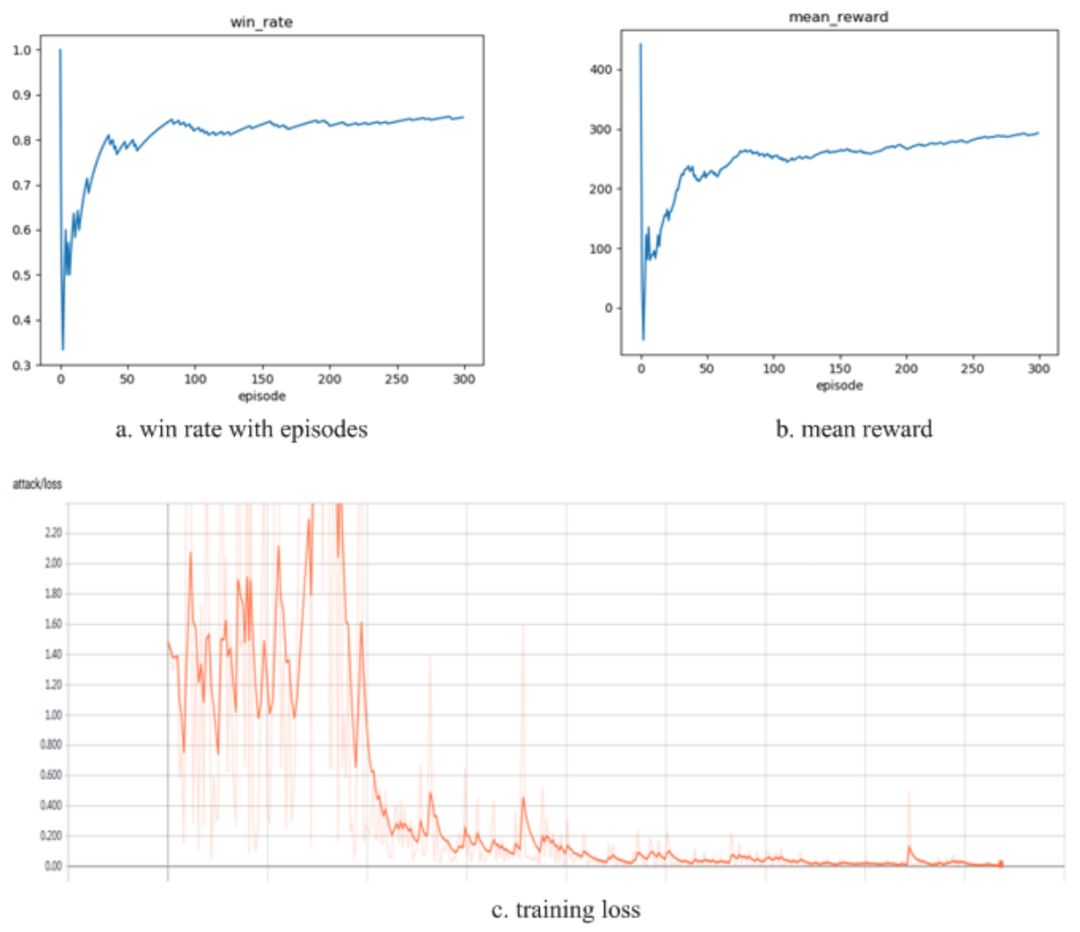 与本文之前的研究不同,这两个网络是同时为外部队伍和内部队伍构建和训练的。图 8 显示了外部队伍的训练结果(内部队伍的训练结果与此类似)。从图中不难看出,训练收敛得非常快(少于 150 个片段,每个片段有 5 场游戏)。外部队伍对战 SL-Human 的胜率提高了 80%,而训练损失接近 0。