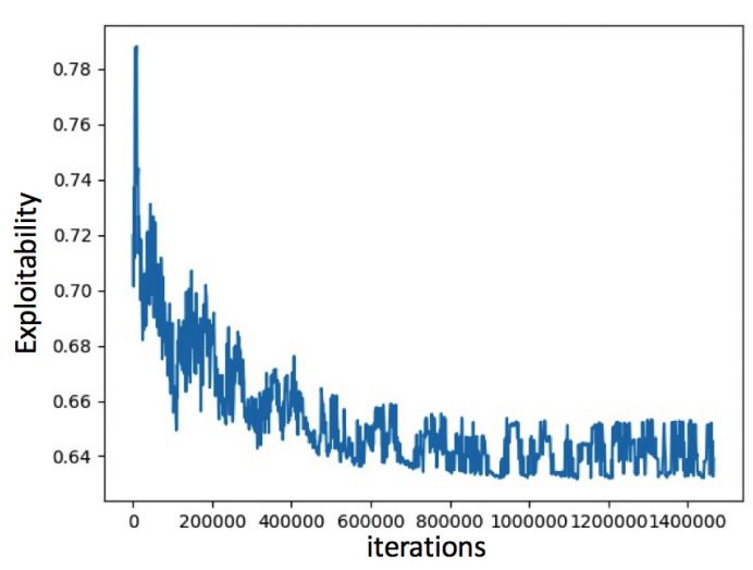 图 5 显示在改进版无限制德州扑克中 ANFSP 接近纳什均衡。可利用性持续降低,并在 140w 个游戏片段后稳定在 0.64 左右。训练时间约 2 小时。