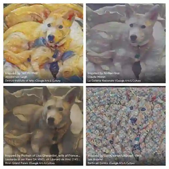 这四张塞尔达的风格分别是梵高,莫奈,达芬奇和克拉斯纳。是的,他家的狗就叫《塞尔达传说:荒野之息》的那个塞尔达。