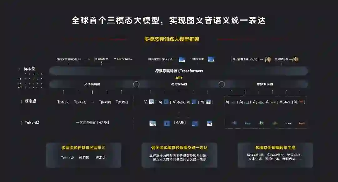 “紫东太初”三模态训练模型采用了多层次多任务自监督预训练的学习方式,论文已经公开发表。最重要的是我们提出来三模态数据的语义统一表达,可同时支持三种或者任两种模态的若干数据预训练。这个模型不仅可以实现跨模态理解,还能实现跨模态生成,做到理解和生成两个最重要的认知能力的平衡,首次实现以图生音,以音来生图的功能。