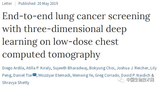 5月20日,知名医学期刊《自然医学》报告了一个人工智能肺癌检测系统,该系统可以通过胸部计算机断层扫描图像(CT)检测恶性肺结节,检测水平超过专业放射科医生。