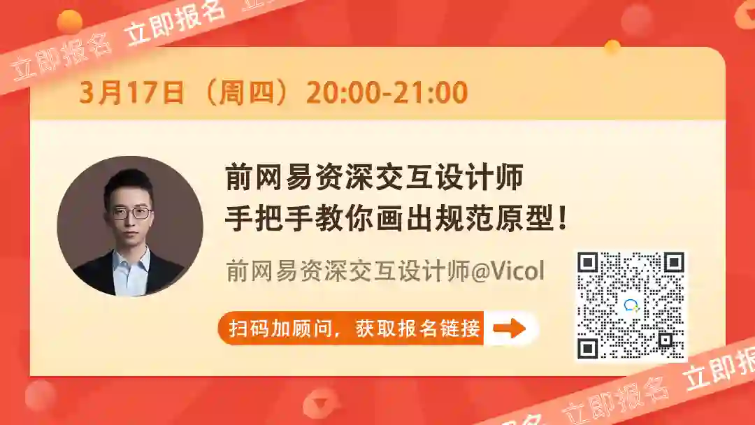 3月17日晚20:00-21:00,前网易资深交互设计师、前小米交互设计师 @Vicol老师,实战演示规范原型图的绘制过程,带你探讨原型设计在产品研发中的位置,揭秘从idea到产品还需要哪些技能来加成。