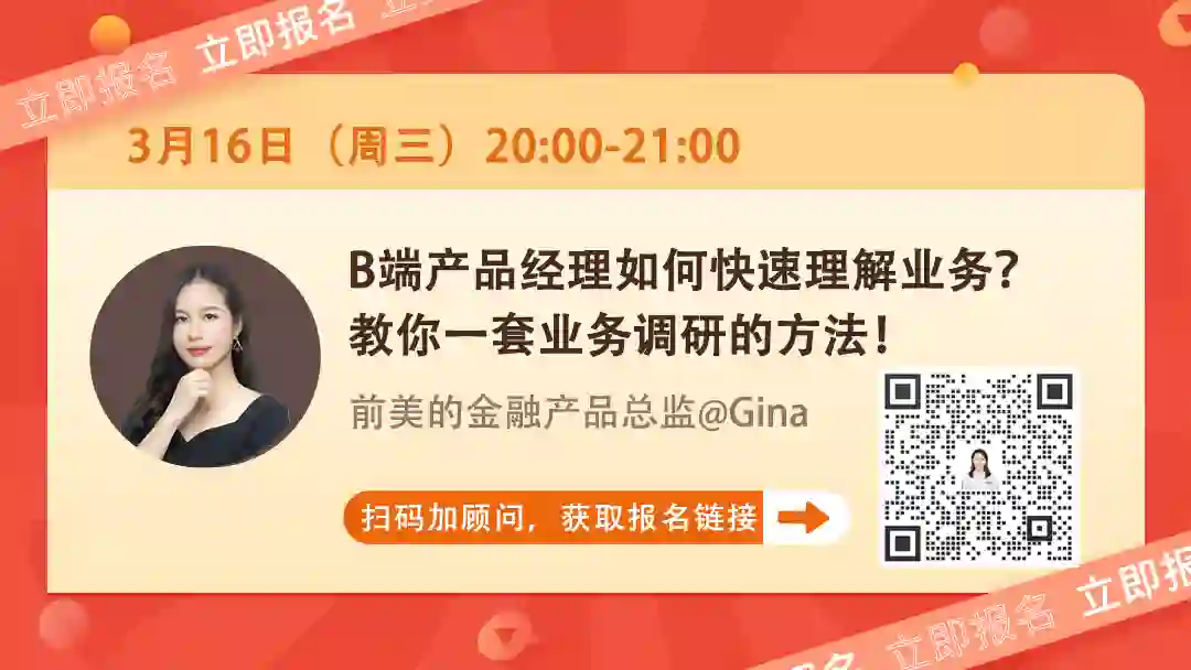3月16日(本周三)晚8点,前美的金融产品总监@Gina老师,1小时帮助你解决业务调研中的思路梳理并通过案例拆解带你洞察用户真实需求~