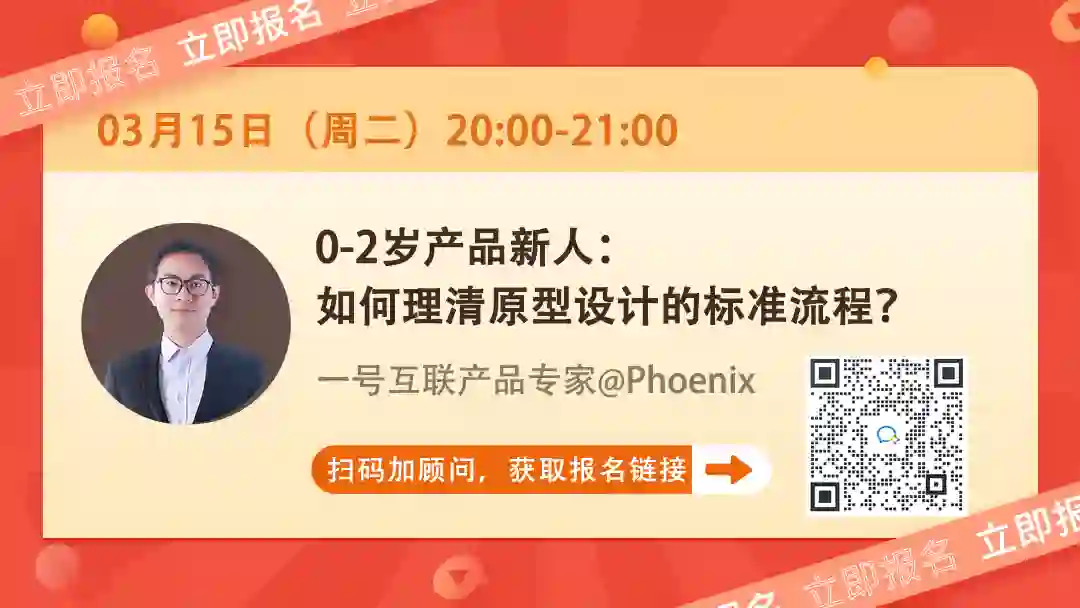 3月15日(周二)晚8点,11年资深产品经理@Phoenix 老师,将实操带你详解【产品原型的标准流程设计】,教你更高效画出规范专业原型!
