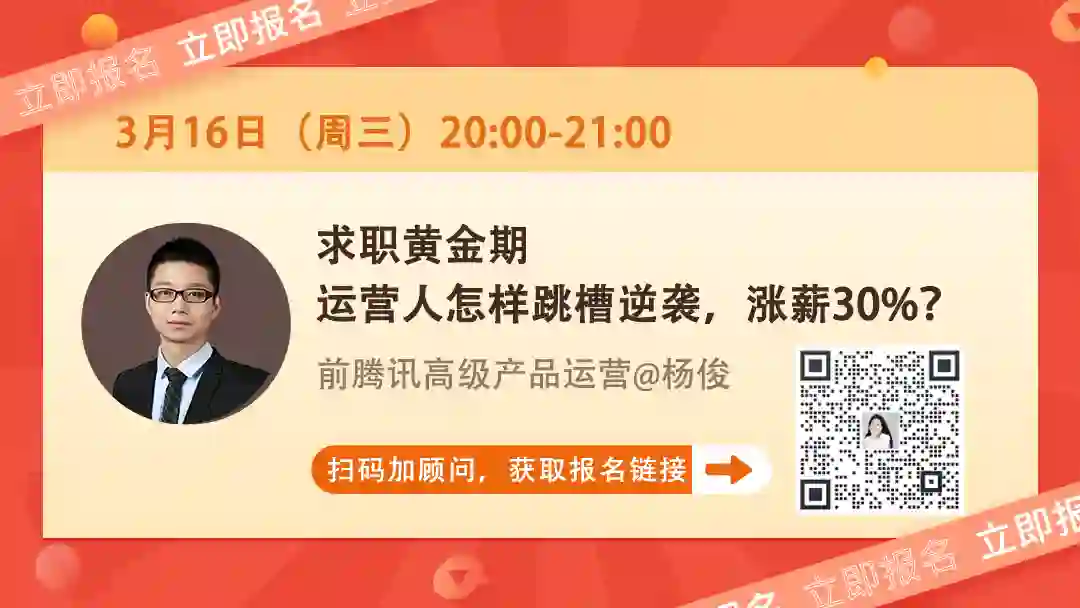3月16日(周三)20:00,前腾讯高级产品运营,将从行情、跳槽的核心问题,以及怎样跳槽三个维度,帮你详细解答跳槽的相关问题,直播最后还可以在线答疑~