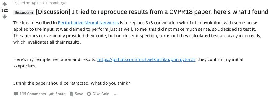 9 月份的时候,Reddit 一位网友在实践一篇论文的时候,发现了一个审核人员都没发现的问题,导致无法复现 CVPR18 论文的结果。
