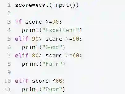 例如下图中的分数评级代码,即使完全不了解Python的人也能通过简单的英文单词迅速理解这段程序想要表达的意思。
