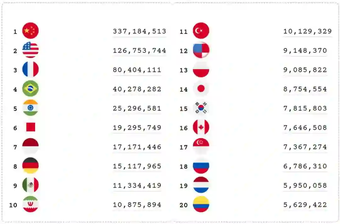 下载数量前三的分别是中国、美国和法国