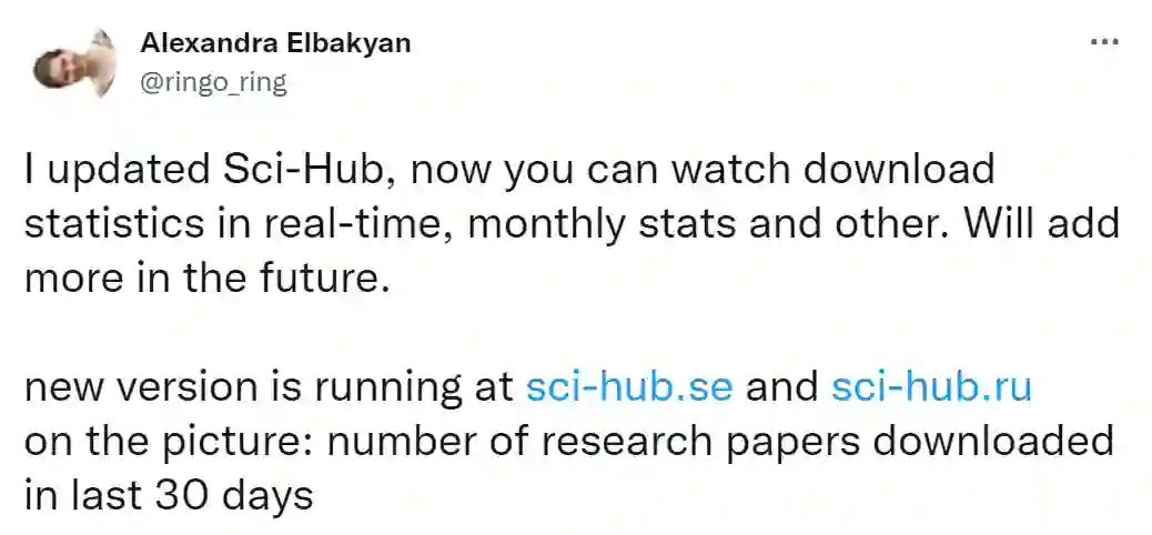 科研界女神、Sci-Hub 创始人 Alexandra Elbakyan 今日发了一条推特,立刻引来科研圈的关注。Elbakyan 表示:「 Sci-Hub 更新了,现在用户可以实时查看下载统计、每月统计等,并在将来会增加更多内容。」