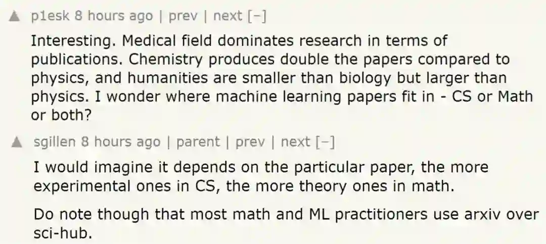 还要网友 @plesk 对 Sci-Hub 数据库的学科细分提出了一个小问题,「机器学习论文属于计算机学科、数学还是两者兼有?」另一网友回复表示,这或许根据具体论文而定,实验多就划分在计算机学科、理论多就划分在数学。