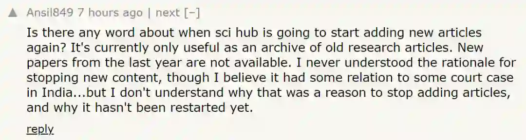 不过,对于 Sci-Hub,网友依然提出了一些疑问。网友 Ansil849 想知道 Sci-Hub 何时才能够重新开始添加新论文,目前仅用作旧论文的存档,甚至 2021 年的新论文都无法获取。虽然知道这肯定与印度的一些起诉案件有关,但不理解为什么这就成为了停止添加新论文的原因以及为什么还没有启动添加新论文。